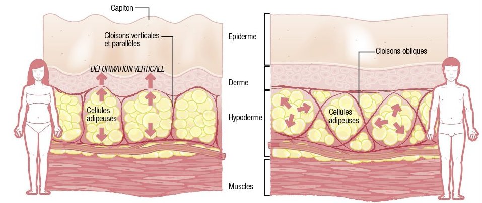 Conséquence : chez la femme, quand les adipocytes se gorgent de graisse, elles exercent une pression directe sur le derme (couche moyenne de la peau) et l’épiderme, au point de le déformer. D’où l’effet peau d’orange…