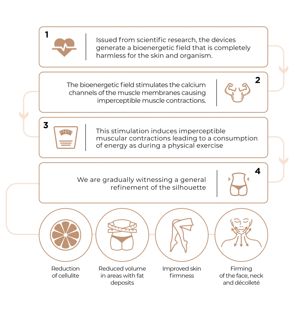 Discover the secret behind BioStimology®. Thanks to its low-frequency magnetic energy field, our technology stimulates your personal metabolism. It activates your muscle membranes, leading to an increase in the amount of energy your body consumes. The result? A slimmer figure and skin that appears smoother, with a clear improvement in skin quality (fewer wrinkles and less cellulite).