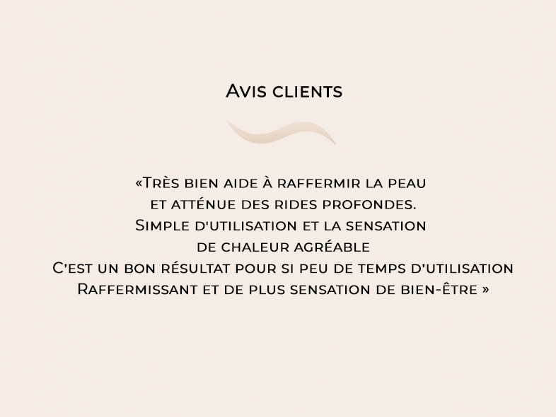 • raffermissement de la peau au niveau de l’ovale du visage avec diminution de 20,2% du score de relâchement (BAZIN), diminution de 9,3% du paramètre R0 (cutomètre) et augmentation de 51,1% de la densité du derme mesurée par échographie